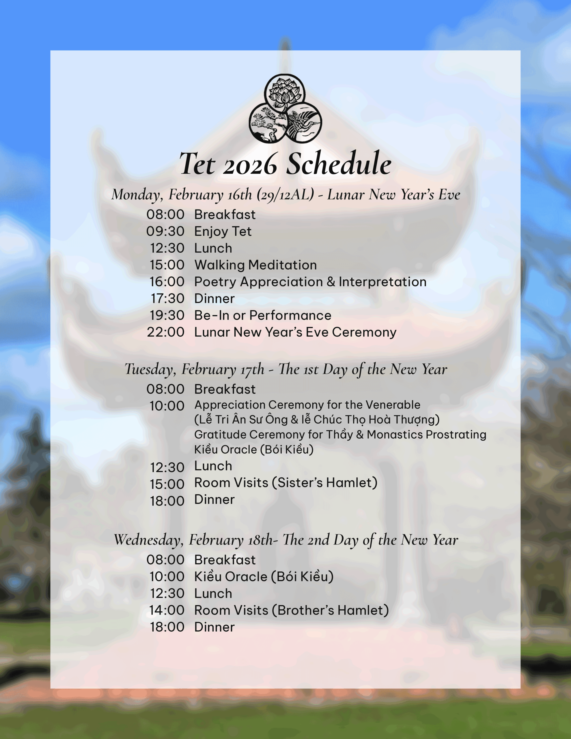 Xuân đang về mang theo hơi ấm, tình thuơng của đất Mẹ và trời Cha. Lắng lòng thật yên để nghe từng tiếng Xuân đang về trên khắp vạn nẻo đường. Hoà cùng không khí và niềm vui đó, quý thầy và quý sư cô tại Tu viện Bích Nham rất mong được gởi đến quý vị gần xa chương trình Xuân Bính Ngọ năm 2026.
